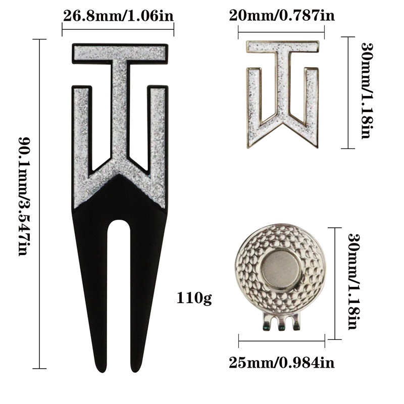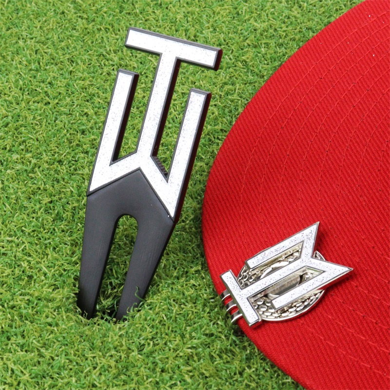 These pieces feature distinct logo silhouettes: a chain-adorned logo hat pin and a logo-shaped golf divot tool. Designed with metallic finishes (black/white, silver/gold), sleek contours, and cohesive logo styling, they blend trendy cap decor with practical golf functionality.