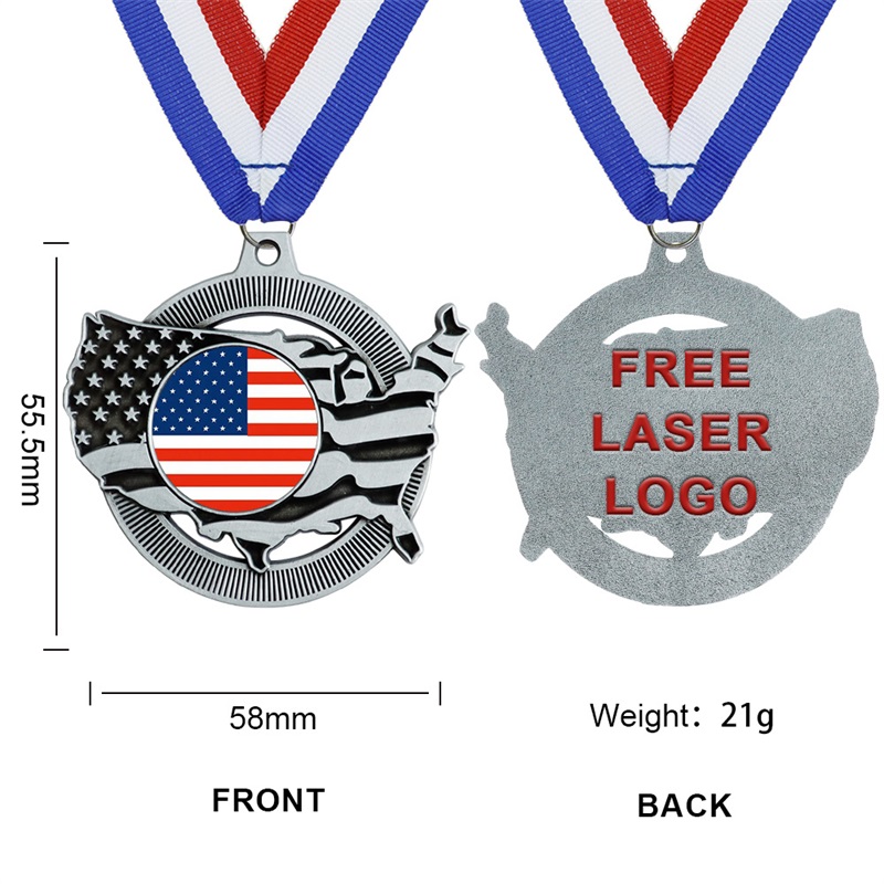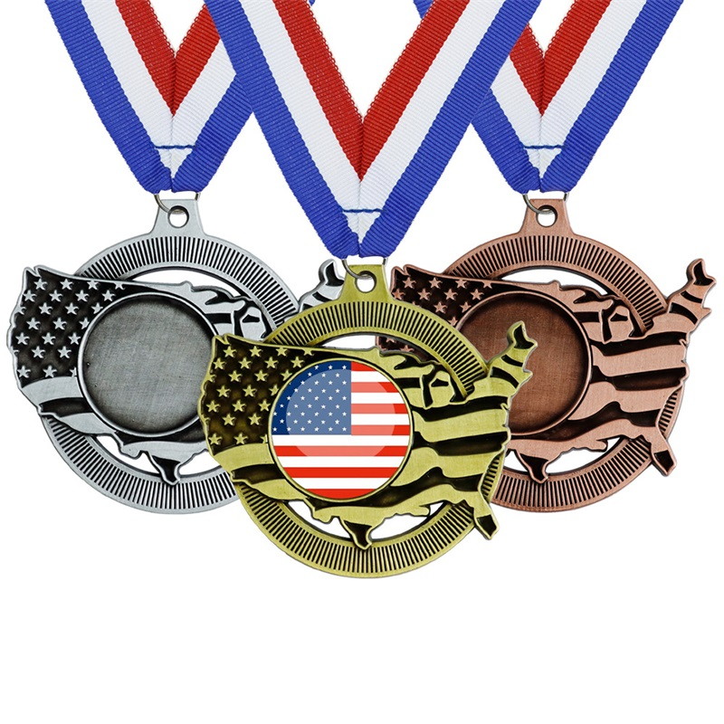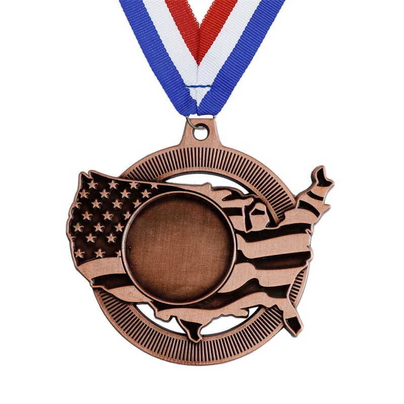Crafted from antique gold/antique silver/antique red copper metal, this medal features a distinct USA map silhouette (paired with flag-inspired detailing) for a patriotic vibe. Its central blank panel is designed to fit custom stickers—ideal for adding event logos, participant names, or achievement labels. Perfect for honoring excellence at American-themed competitions, community events, or youth programs, it blends national symbolism with flexible, personalized recognition.