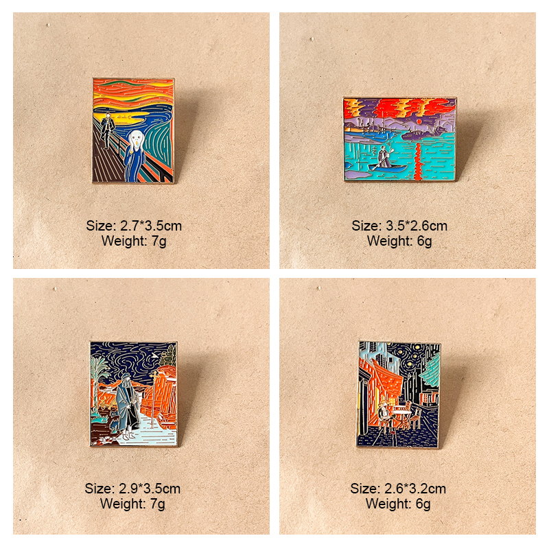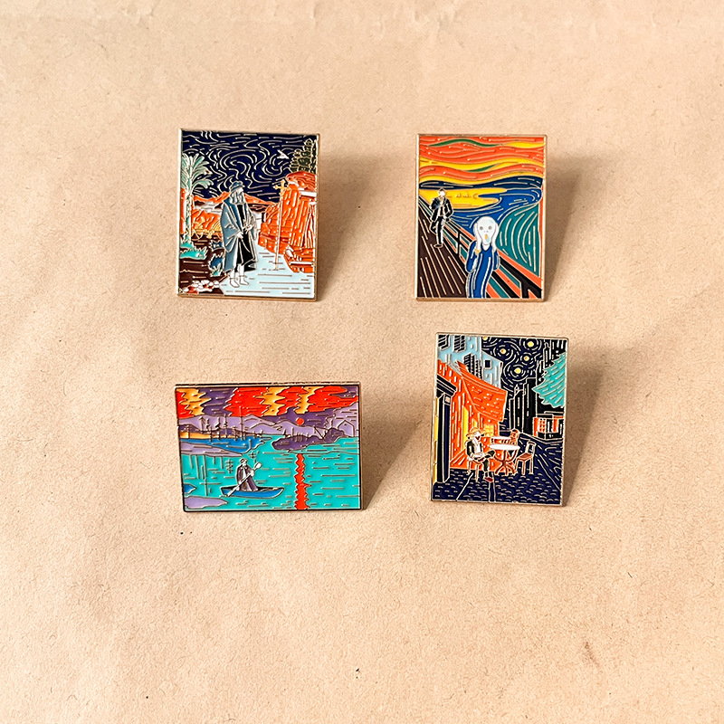 4 vivid pins reimagine classic art (like The Scream, Van Gogh scenes) with bold, post-impressionist hues—intricate details capture artistic flair. Perfect for art lovers to adorn bags/jackets or display as cultured collectibles.