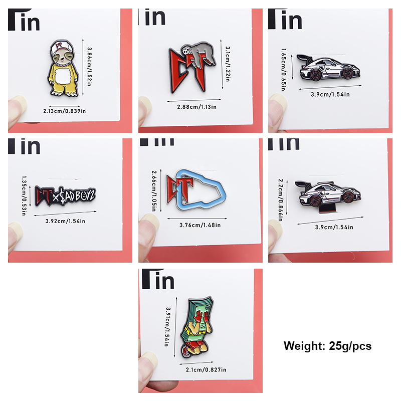 These pin badges boast diverse shapes—3D car silhouettes, bold geometric logos, and cute character cutouts. Each design blends vibrant enamel coloring with sharp, detailed outlines, merging playful aesthetics with sleek, modern styling for standout accessory appeal.