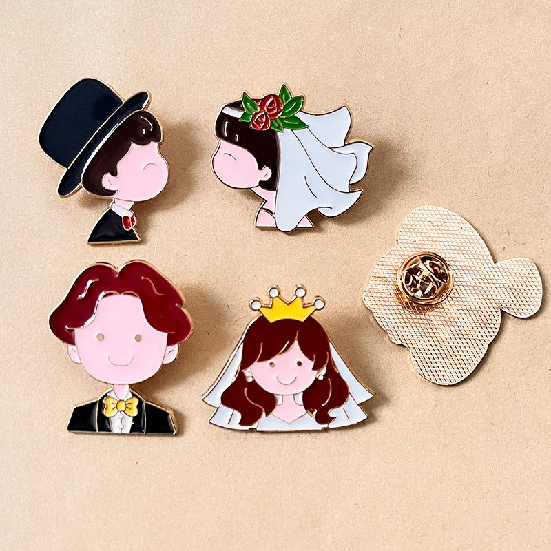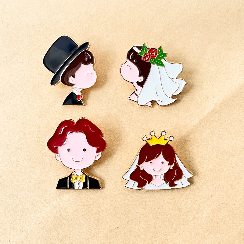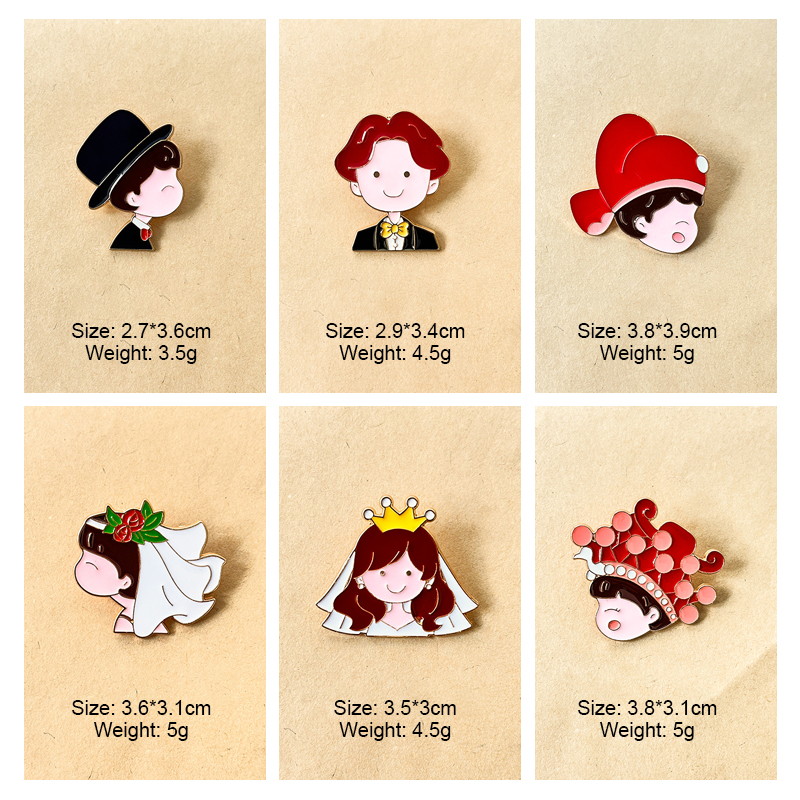 6 cute wedding-themed pins (groom suits, bride veils/crowns) — glossy enamel, delicate details. Perfect for adding romantic flair to bags/jackets; ideal for wedding favors or romantic collectible decor.